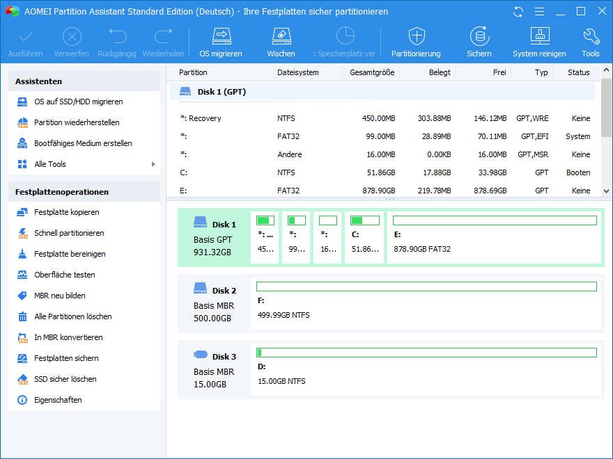 Schritt 1. Download, Installation und Start von AOMEI Partition Assistant. Sie werden seine prägnante Hauptschnittstelle mit der Grundumgebung Ihrer Festplatte(n) sehen.