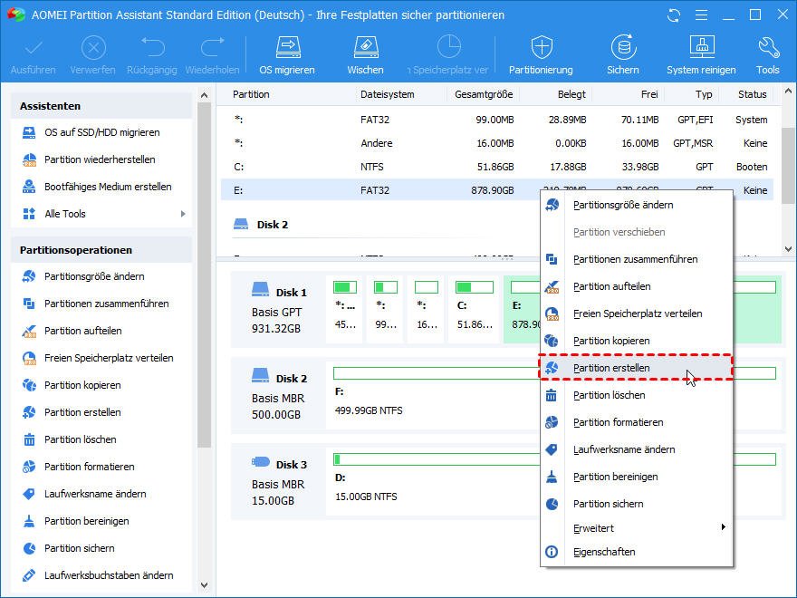 Methode 1: Partition erstellen mit AOMEI Partition Assistant GUI