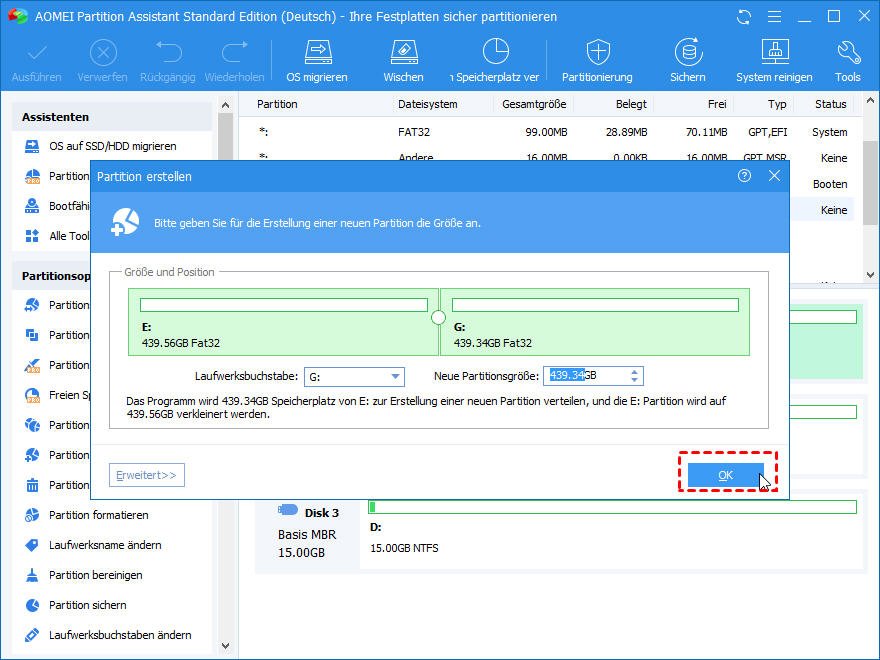Schritt 3. Nachdem Sie auf „Partition erstellen“ geklickt haben, wird ein Fenster angezeigt, in dem Sie die Partitionsgröße ändern können, und dann klicken Sie auf „OK“.