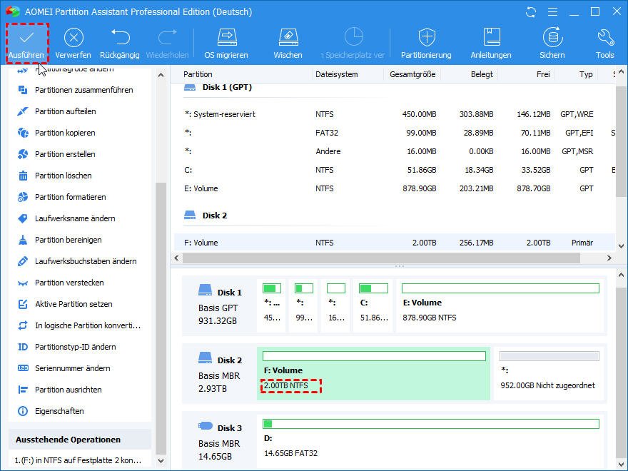 Wenn Sie nach all diesen Versuchen immer noch nicht die ausreichenden Berechtigungen erhalten, ist es ratsam, Aufgaben auf andere Weise zu erledigen. AOMEI Partition Assistant ist ein kostenloser Partitionsmanager für Festplatten, der sich bei der Festplattenwartung einen eigenen Namen gemacht hat. Sie können damit USB-Laufwerk, SD-Karte und USB-Stick schnell und effektiv formatieren, und Festplattenoberflächentests und Partitionsprüfungen erfolgreich durchführen. Keine Berechtigungen erforderlich.