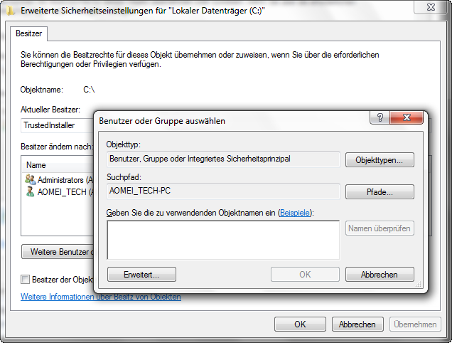 3. Klicken Sie auf den Link Besitzer > Bearbeiten > Weitere Benutzer oder Gruppe, und das Dialogfeld Benutzer oder Gruppe auswählen wird angezeigt.