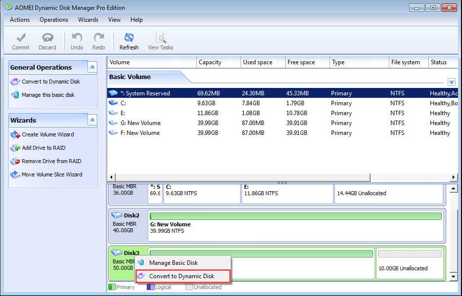 Danach können Sie einfach mit der Windows-Datenträgerverwaltung den Basisdatenträger in dynamischen Datenträger konvertieren. Oder Sie können auch die Funktion namens Dynamische Datenträger verwalten von AOMEI Partition Assistant verwenden.