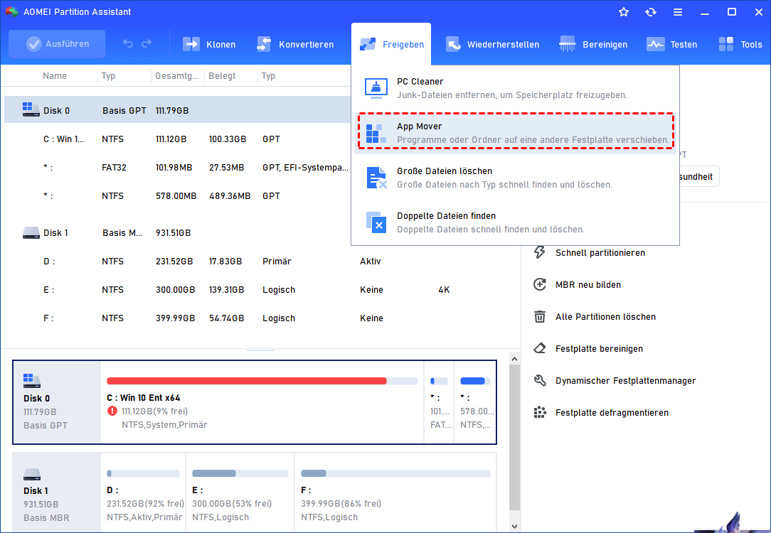 Tatsächlich enthält AOMEI Partition Assistant viele weitere erweiterte Funktionen, um verschiedene Festplattenprobleme zu lösen und Ihren Computer besser zu verwalten. Wenn Sie beispielsweise mehr Speicherplatz benötigen, damit Ihr PC schneller läuft, können Sie Folgendes versuchen: Laufwerk C erweitern, große Dateien löschen, Festplatte bereinigen, auf SSD aktualisieren, Apps/Dateien auf ein anderes Laufwerk verschieben und mehr.