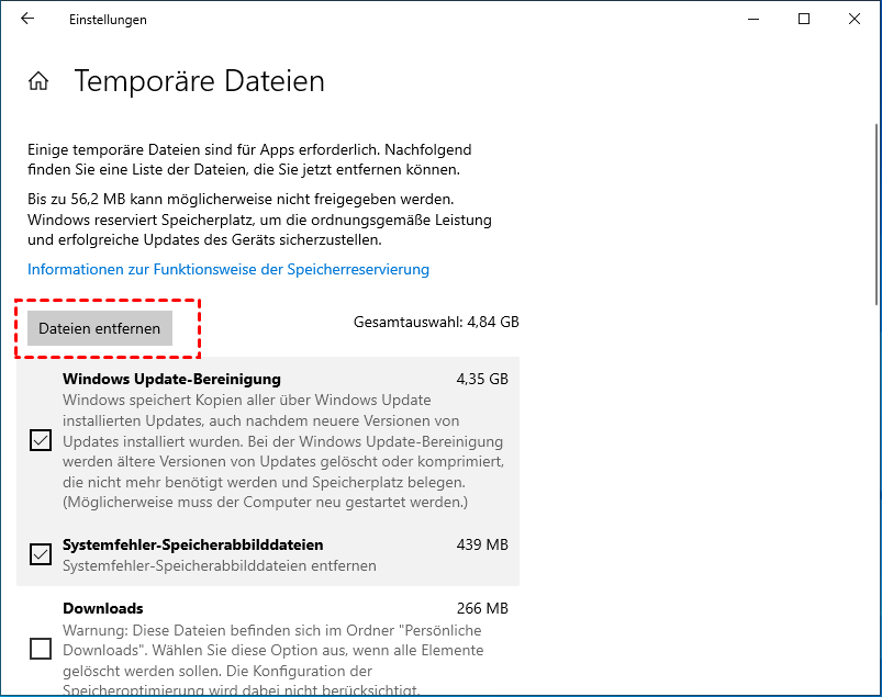 Schritt 5. Wenn Sie Dateien manuell löschen müssen, können Sie auf „Temporäre Dateien“ klicken. Markieren Sie die Dateitypen, die Sie löschen möchten, und klicken Sie dann auf „Dateien entfernen“.