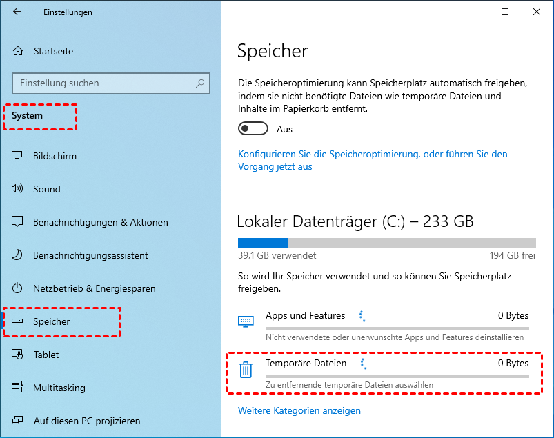 Schritt 5. Nachdem Sie in den abgesicherten Modus gewechselt sind, gehen Sie zu „Einstellungen“ > „System“ > „Speicher“ > „Temporäre Dateien“.