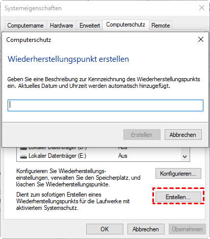 Schritt 3. Klicken Sie im Dialogfeld Systemeigenschaften auf „Erstellen“.