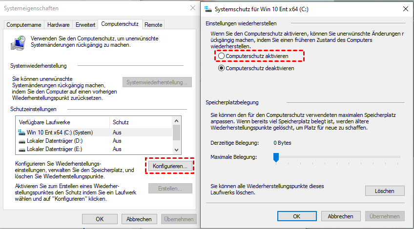 Schritt 2. Bevor Sie einen Wiederherstellungspunkt erstellen, müssen Sie die Schutzeinstellungen für das Volume aktivieren, das Sie sichern möchten. In unserem Fall ist es das Laufwerk C. Um es einzuschalten, wählen Sie C aus der Liste der Laufwerke unter Schutzeinstellungen und klicken Sie auf „Konfigurieren“. Wählen Sie die Option „Computerschutz aktivieren“ und klicken Sie auf „OK“.