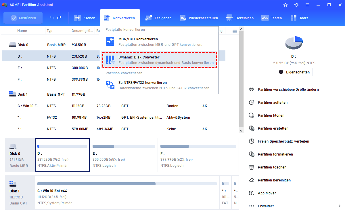 Auf der anderen Seite können Sie in der Tat Partition Assistant nutzen, wenn Sie Basis-Datenträger in dynamische Datenträger konvertieren wollen. Außerdem können Sie auch Windows-Datenträgerverwaltung verwenden.