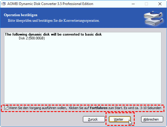 Schritt 5. Bestätigen Sie Ihre Operation und klicken Sie dann auf Fortfahren. Beachten Sie, dass Sie „Wenn Sie den Vorgang ausführen wollen, klicken Sie auf Fortfahren zum Start. Es wird ca. 3-10 Sekunden dauern.“ ankreuzen sollen, bevor Sie auf Fortfahren klicken, um zu zeigen, dass Sie die entsprechenden Informationen bestätigt haben.