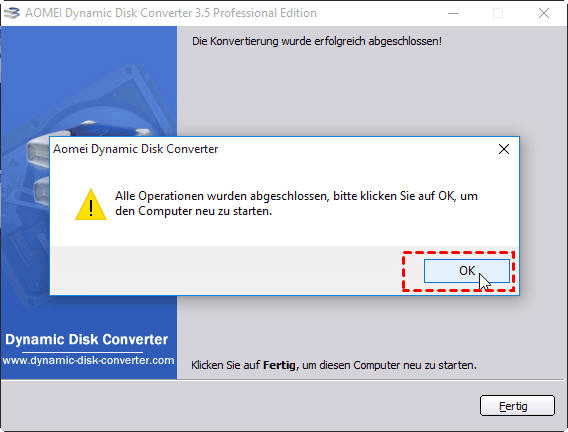 Schritt 6. AOMEI Dynamic Disk Converter wird Sie mitteilen, sobald die Operation abgeschlossen ist. Klicken Sie auf OK -> Fertig, um die Operation zu beenden.