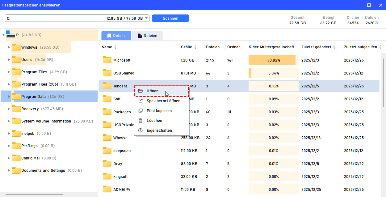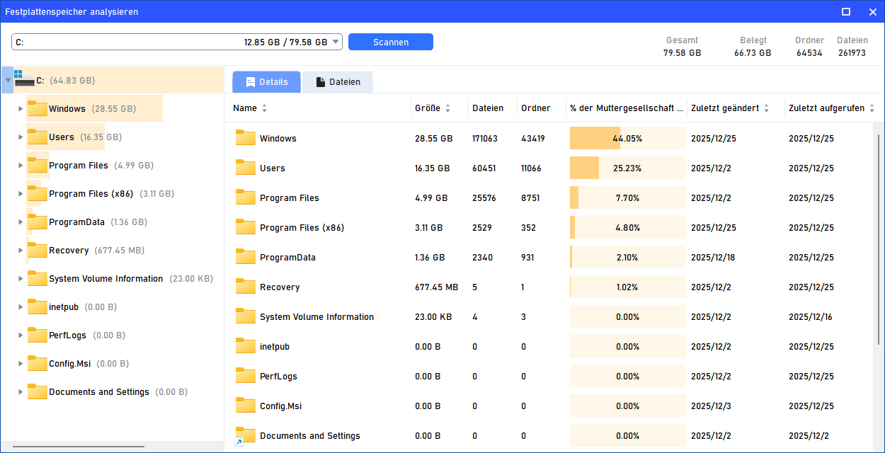 Nach Abschluss der Analyse werden die Details zum Partitionsspeicherplatz angezeigt, darunter der gesamte und der belegte Speicherplatz, die Anzahl der Dateien und Ordner usw. Standardmäßig werden die Ordner auf der Partition in absteigender Reihenfolge nach Größe von oben nach unten aufgelistet.