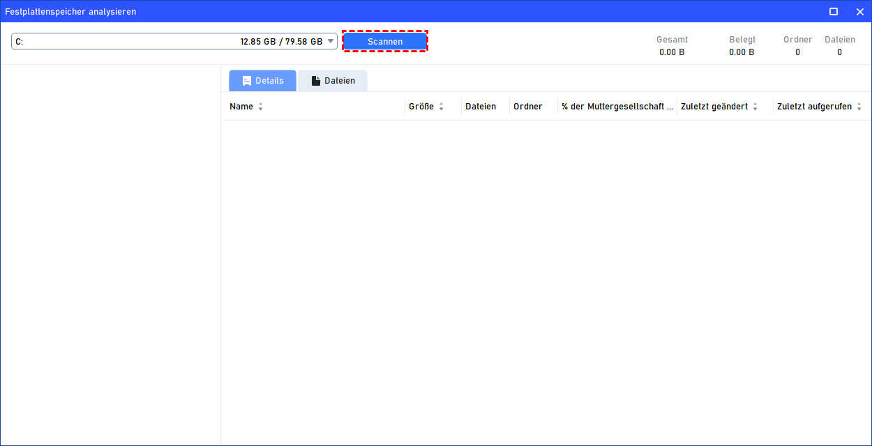 Wählen Sie eine Partition auf Ihrem Computer aus und klicken Sie auf die Schaltfläche „Scannen“, um mit der Analyse des Partitionsspeicherplatzes zu beginnen.