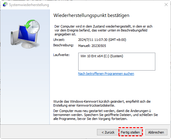 Schritt 3: Bestätigen Sie den Wiederherstellungspunkt im nächsten Fenster und klicken Sie auf Fertig stellen, um Ihren Computer in diesen Zustand wiederherzustellen.