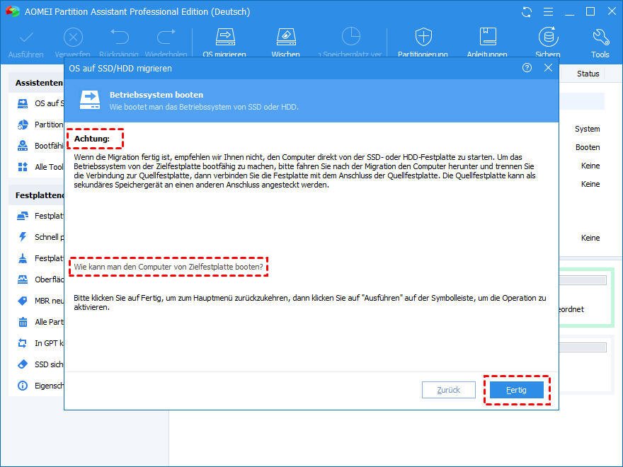 Nachdem Sie das Betriebssystem mit einer der von AOMEI Partition Assistant Professional bereitgestellten Methoden von HDD auf SSD geklont haben, müssen Sie die folgenden zusätzlichen Schritte ausführen, um Ihren Computer von der Zielfestplatte zu booten.