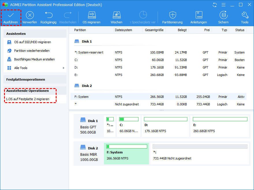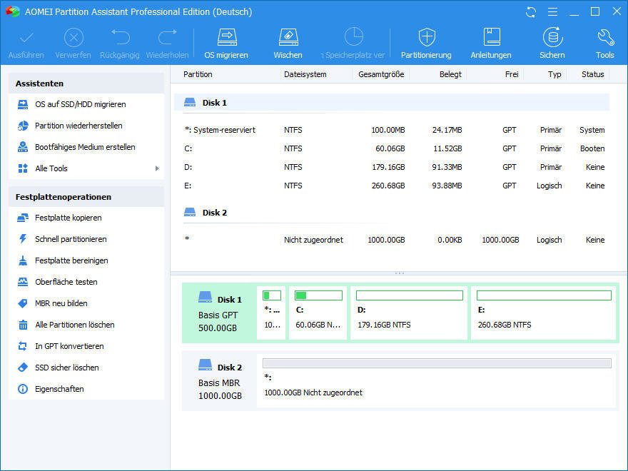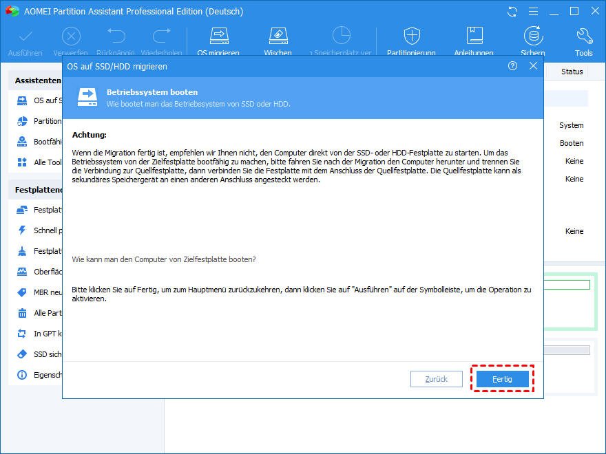 Mit wenigen einfachen Schritten kann man erfolgreich mithilfe von AOMEI Partition Assistant die GPT-Systemfestplatte auf SSD klonen. Außerdem können Sie bei Bedarf nur das Windows Betriebssystem auf SSD migrieren, indem Sie die Funktion „OS auf SSD migrieren“ verwenden.