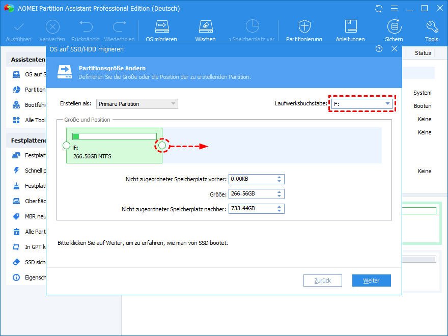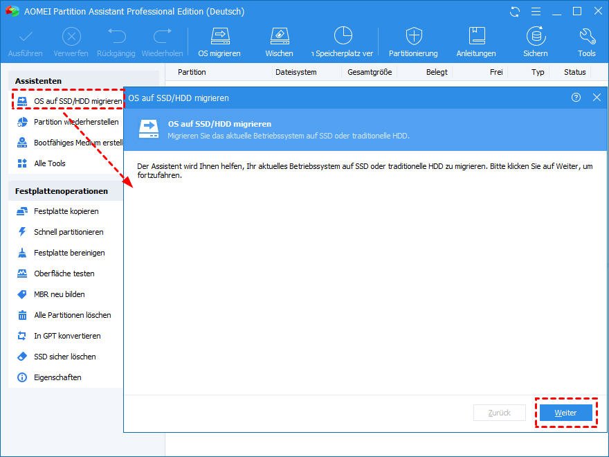 Wenn Sie Windows 10 auf eine neue SSD ohne Neuinstallation migrieren möchten, wird hier AOMEI Partition Assistant empfohlen. Mit dieser Software können Sie mit der neuen Funktion „OS auf SSD/HDD migrieren“ die GPT-Systemfestplatte auf neue SSD klonen, ohne das Betriebssystem und die Anwendungen neu zu installieren.