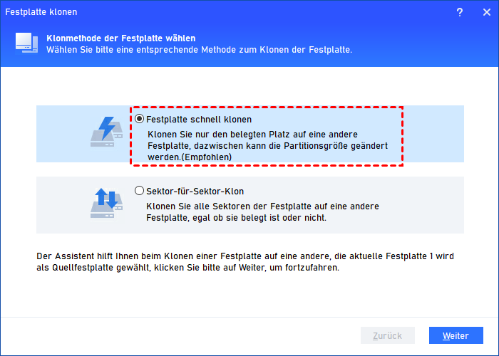 Es bietet zwei Klonmethoden: Festplatte schnell klonen (Standard) und Sektor-für-Sektor-Klon. Ersteres ermöglicht es Ihnen, GPT-Festplatten auf kleinere SSDs zu klonen, und letzteres ermöglicht Ihnen, die gesamte Originalfestplatte zu klonen.