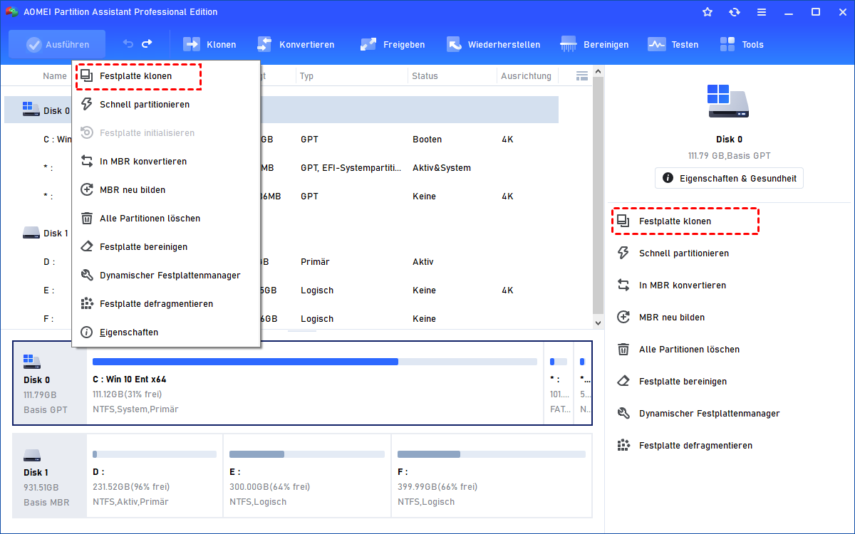 Windows hat kein eingebautes Klon-Tool, also müssen wir uns an Software von Drittanbietern wenden. Ich empfehle Ihnen AOMEI Partition Assistant Professional, eine leistungsstarke Klonen-Software, die Benutzern helfen kann, GPT-Systemfestplatte auf SSD ohne Datenverlust zu klonen.