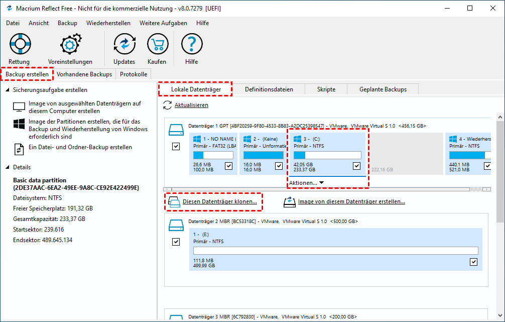 Schritt 1. Wählen Sie die Registerkarte „Backup erstellen“ und dann „Lokale Datenträger“. Dies zeigt eine grafische Darstellung der Festplatten, die lokal an das System angeschlossen sind. Wählen Sie die Festplatte aus und wählen Sie dann „Diesen Datenträger klonen…“, die unter der ausgewählten Festplatte angezeigt wird.