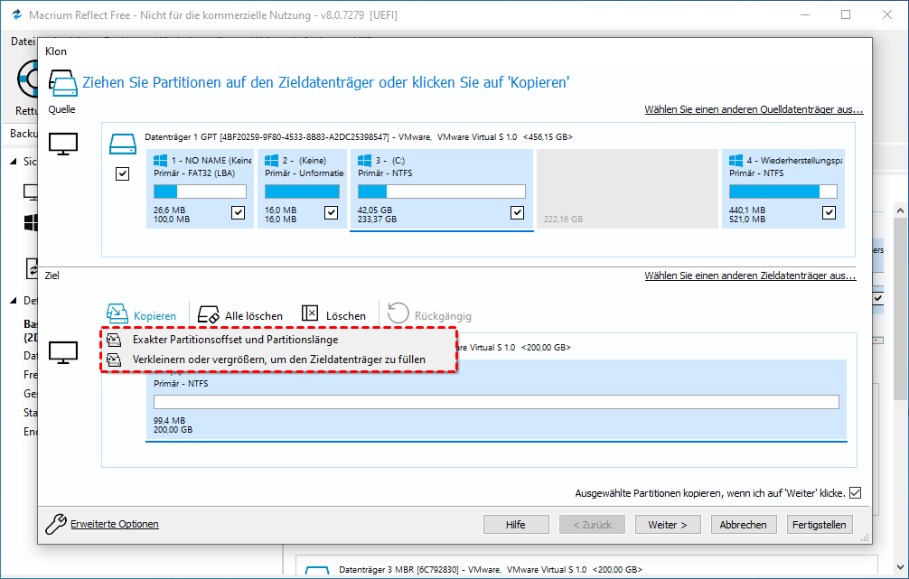 Schritt 4. Durch Auswahl von „Exakter Partitionsoffset und Partitionslänge“ werden die ausgewählten Partitionen von der Quellfestplatte auf das Ziel mit genau demselben Partitionsoffset und derselben Länge kopiert. Wenn Sie „Verkleinern oder vergrößern, um den Zieldatenträger zu füllen“ auswählen, wird die Größe der Partitionen auf dem Ziel so geändert, dass der gesamte verfügbare Speicherplatz auf der Festplatte genutzt wird.