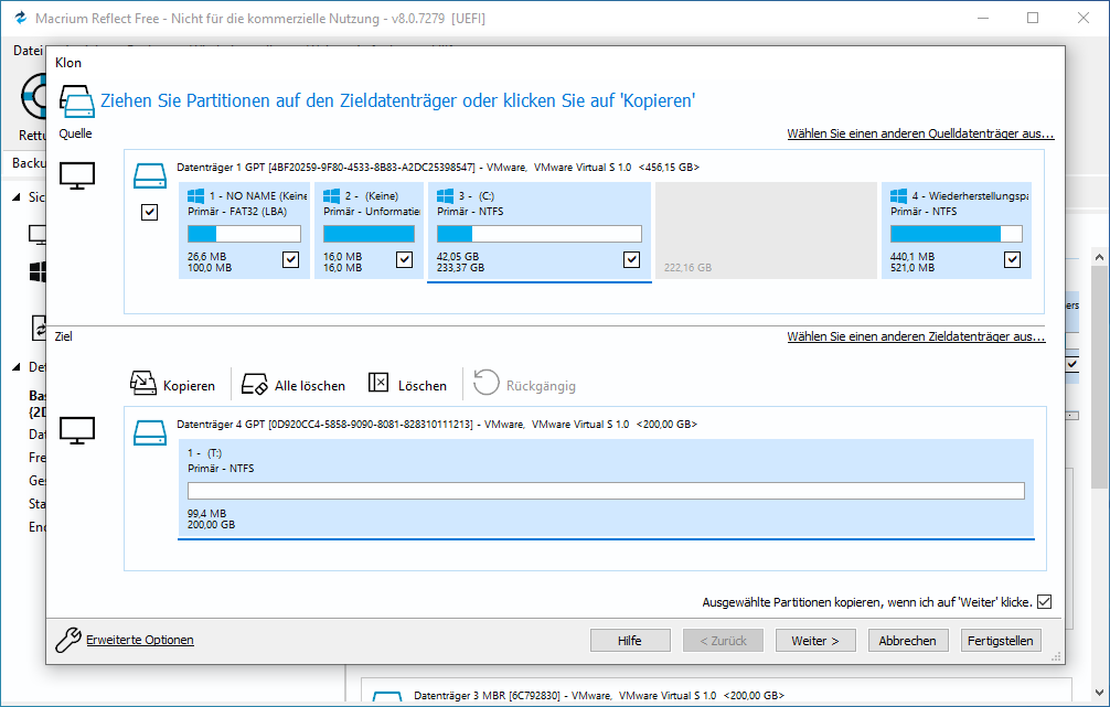 Schritt 3. Ziehen Sie Partitionen auf den Zieldatenträger oder klicken Sie auf „Kopieren“.