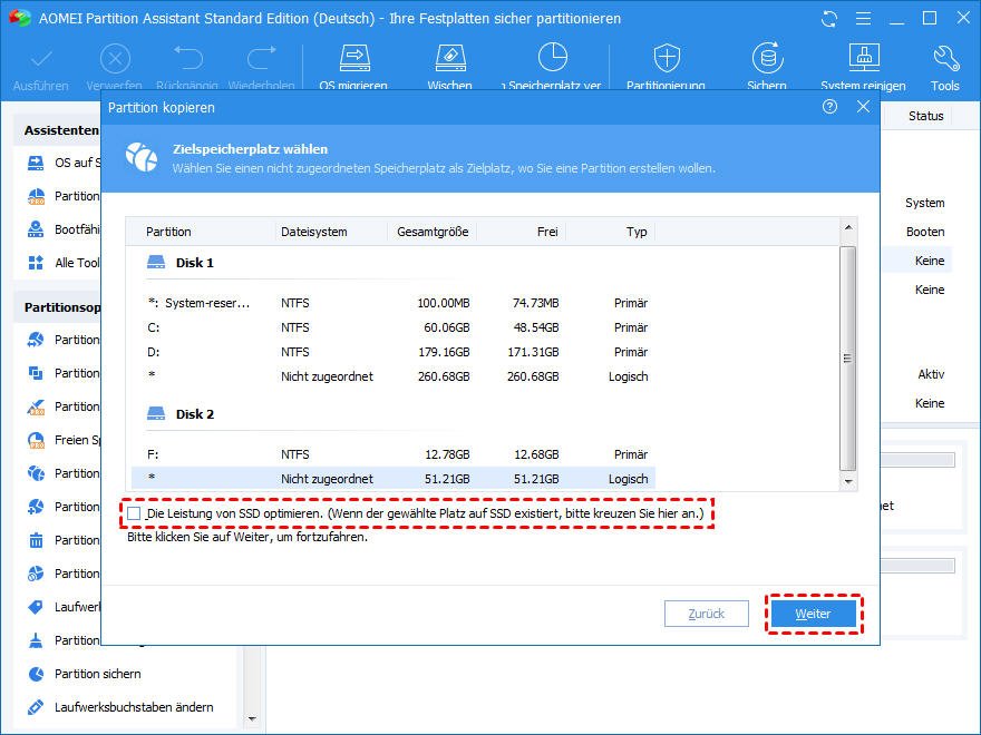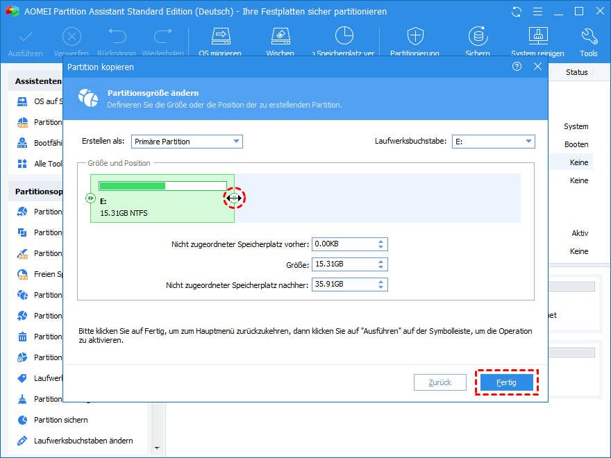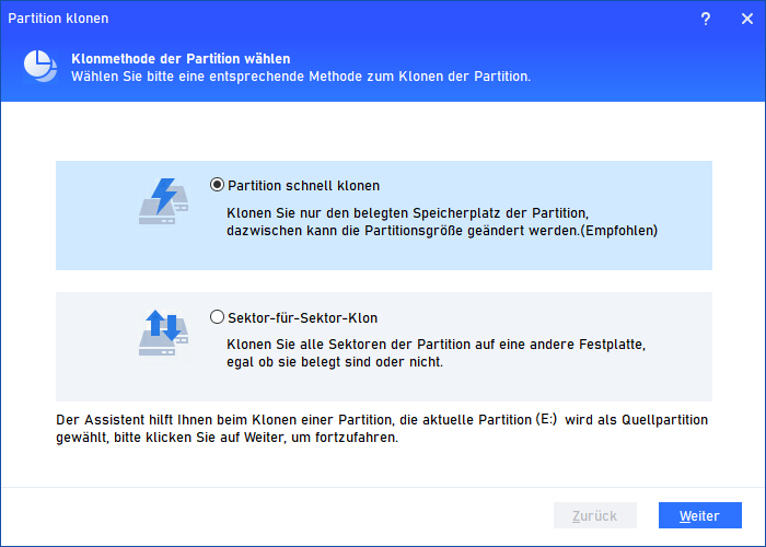 - Bitte schließen Sie Programme, die auf der Partition laufen, die Sie kopieren möchten, sonst wird dieser Kopiervorgang im PreOS-Modus ausgeführt.
