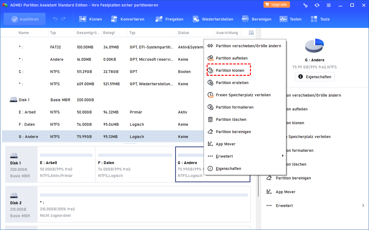 AOMEI Partition Assistant ist es ein hervorragendes Tool, die Festplatte und Partition zu verwalten. Mit dieser Software können Sie eine größere Partition auf eine kleinere Partition klonen oder eine kleinere Festplatte auf eine größere Festplatte zu kopieren.