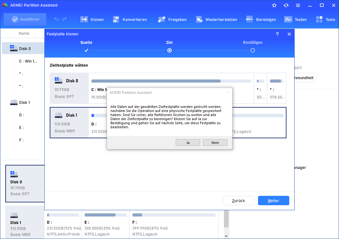 Schritt 3. Dann erscheint ein kleines Fenster, das Sie darüber informiert, dass durch diesen Klonvorgang alle Partitionen und Daten auf der ausgewählten Zielfestplatte gelöscht werden. Stellen Sie also sicher, dass Sie eine Sicherungskopie erstellt haben, und klicken Sie dann auf „Ja“, um Ihren Vorgang zu bestätigen.