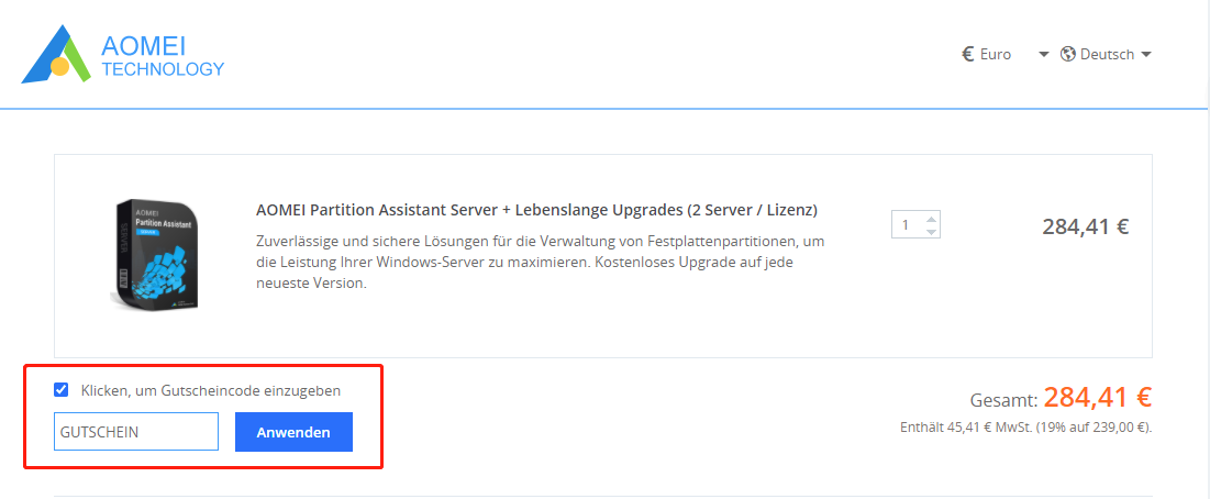 Wählen Sie „Gutscheincode“. Fügen Sie im Popup-Fenster den Gutschein ins Textfeld ein und wählen Sie „Anwenden“.