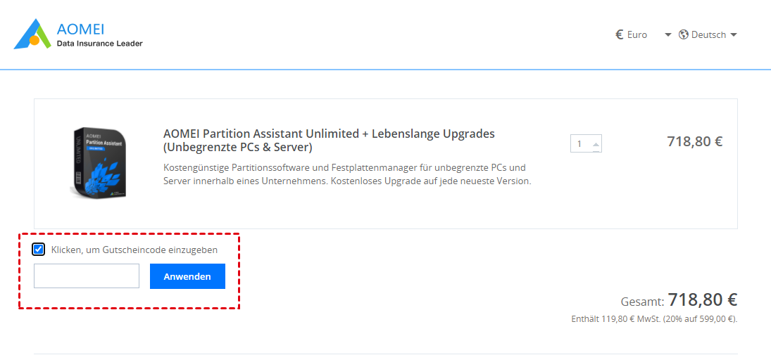 Wählen Sie "Gutscheincode". Fügen Sie im Popup-Fenster den Gutschein ins Textfeld ein und wählen Sie "Anwenden".