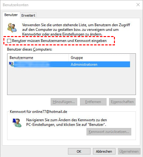 Methode 1. Administratorkennwort umgehen mit „netplwiz“