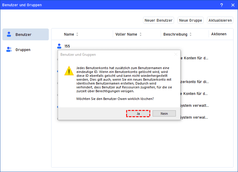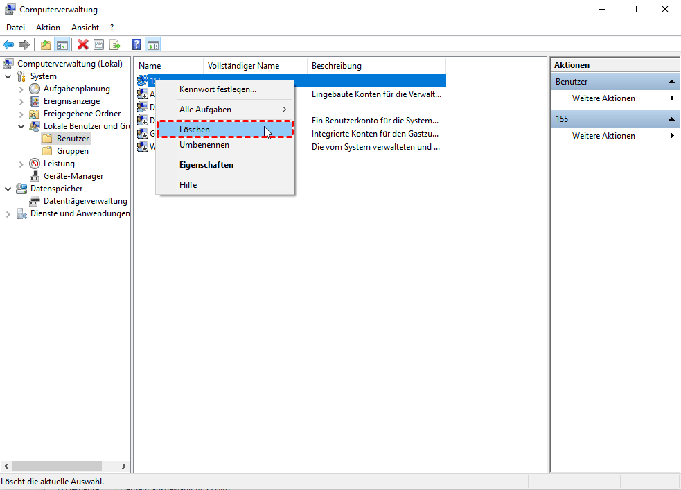 4. Klicken Sie auf die Option „Löschen“, um das überflüssige Benutzerkonto zu löschen.