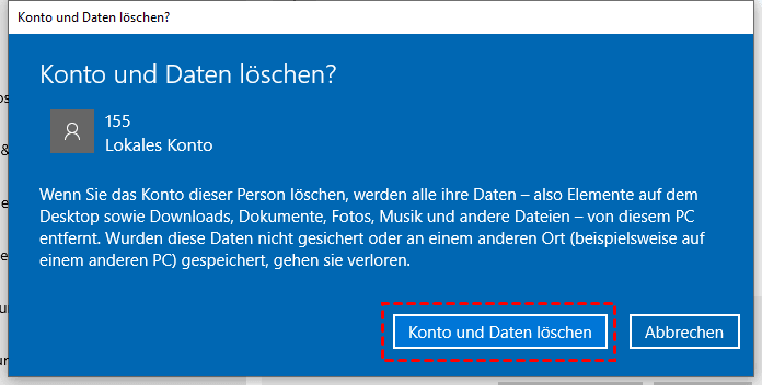 5. Windows fragt nach einer Bestätigung. Wählen Sie Konto und Daten löschen, wenn Sie sicher sind.