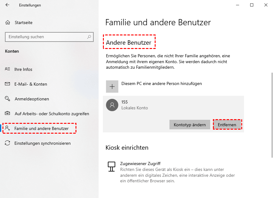 4. Klicken Sie auf das betreffende Konto und wählen Sie Entfernen.