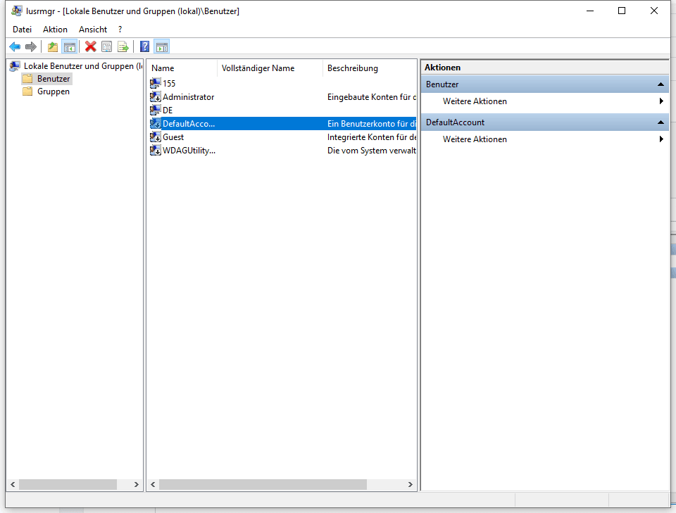 4. Nun öffnet sich das Fenster „Lokale Benutzer und Gruppen“. Hier können Sie: neue Benutzer anlegen, Gruppenmitgliedschaften bearbeiten, oder Konten deaktivieren und löschen.