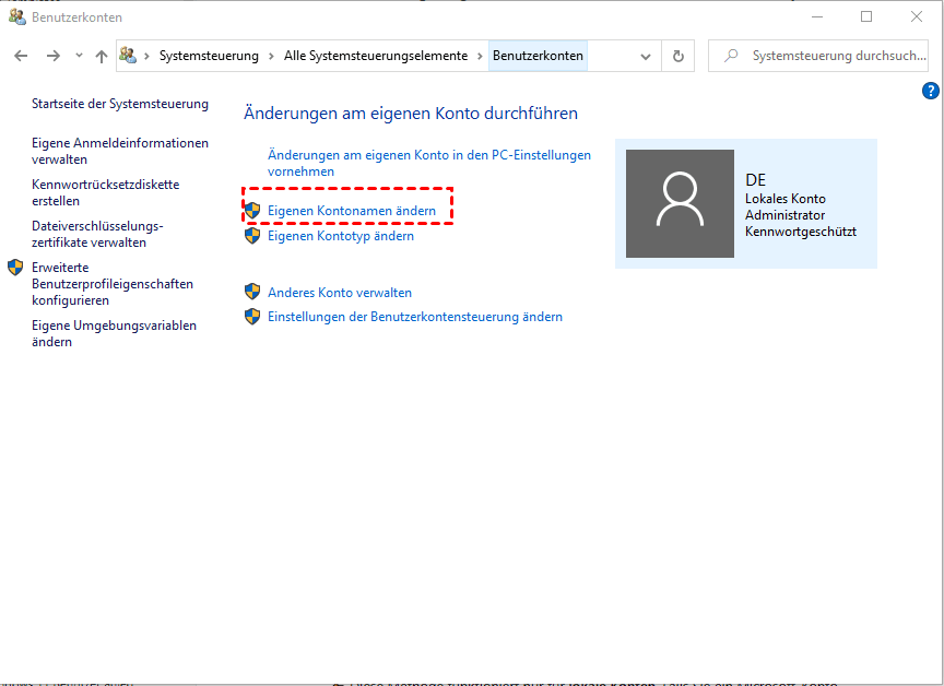 Sie können ein Kennwort festlegen, das Benutzerkonto umbenennen, löschen und die Eigenschaften des Benutzerkontos bearbeiten.