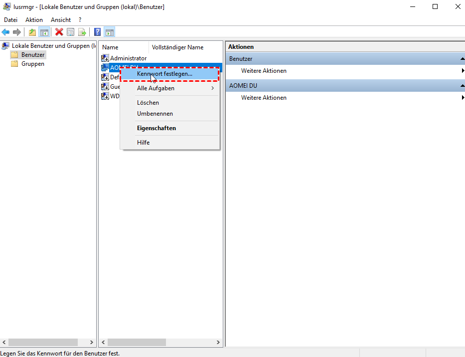 Schritt 2. Klicken Sie im linken Bereich auf „Benutzer“, dann mit der rechten Maustaste auf das Administratorkonto und auf „Kennwort festlegen“.