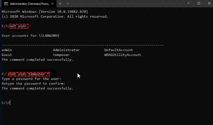 Schritt 2. Geben Sie „net user tempuser*“ ein und drücken Sie „Enter“ (Sie können „tempuser“ durch das Zielkonto ersetzen). Dann können Sie ein Passwort festlegen. Wenn die Aufgabe abgeschlossen ist, wird das Administrator-Passwort des Zieladministrators entfernt.