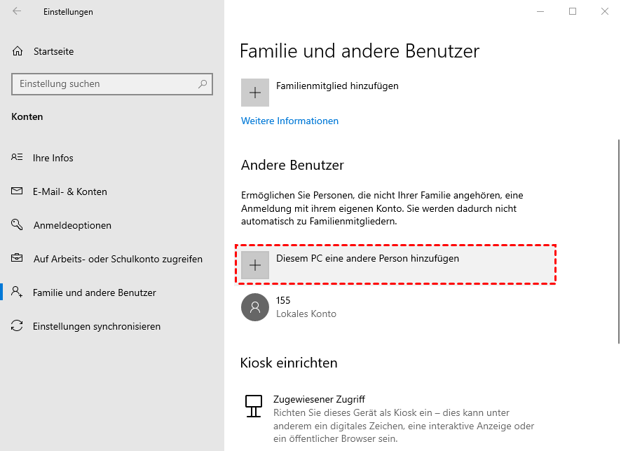 3. Unter „Andere Benutzer“ wählen Sie Diesem PC eine andere Person hinzufügen.