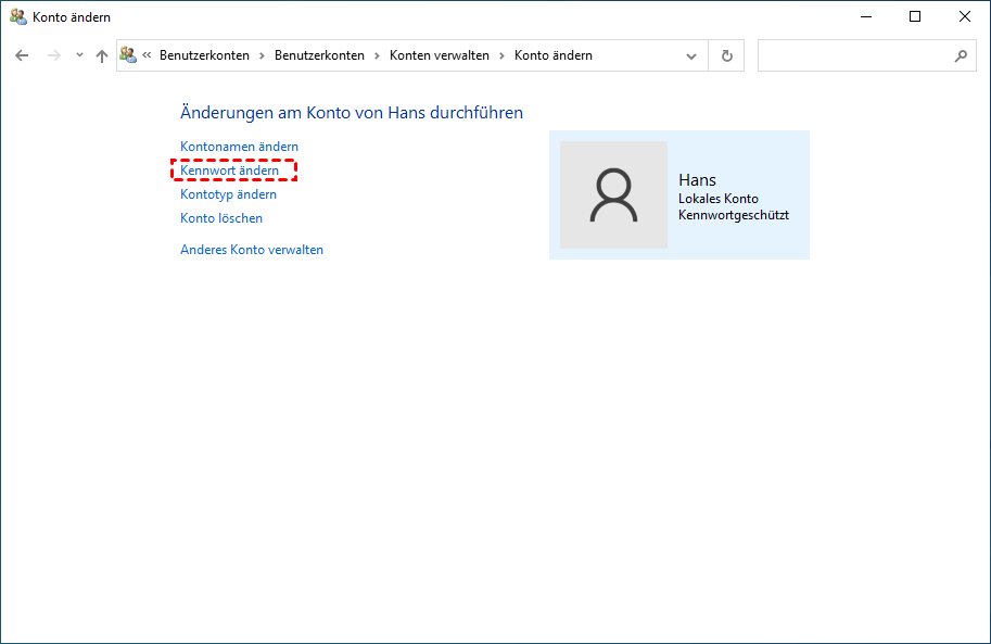 Schritt 3. Wählen Sie dann das Konto aus, dessen Passwort Sie entfernen möchten. Und klicken Sie auf „Kennwort ändern“.