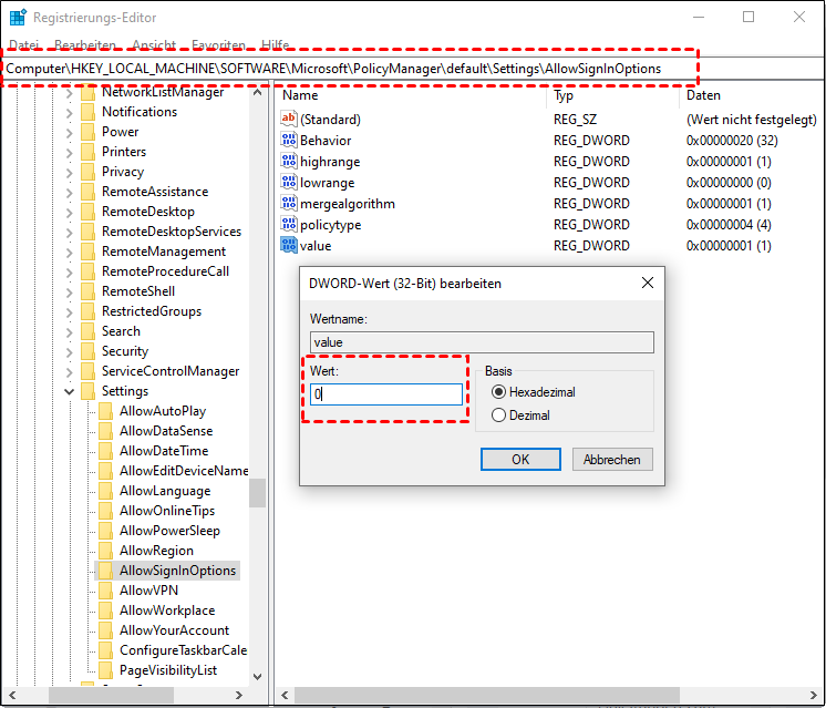 Methode 3. Windows 10 PIN deaktivieren mit Registrierungs-Editor