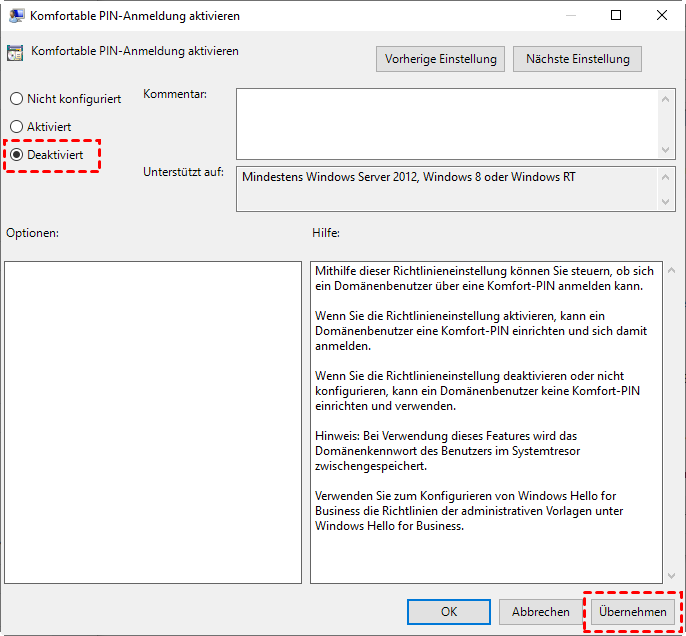 Schritt 3: Suchen Sie die Richtlinie Komfortable PIN-Anmeldung aktivieren. Doppelklicken Sie darauf, wählen Sie Deaktiviert und klicken Sie auf Übernehmen > OK.