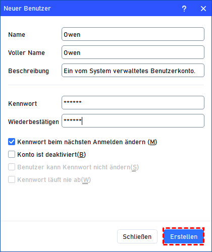 Schritt 4: Geben Sie Benutzername, Passwort und ggf. eine Beschreibung ein. Dann klicken Sie auf „Erstellen“.