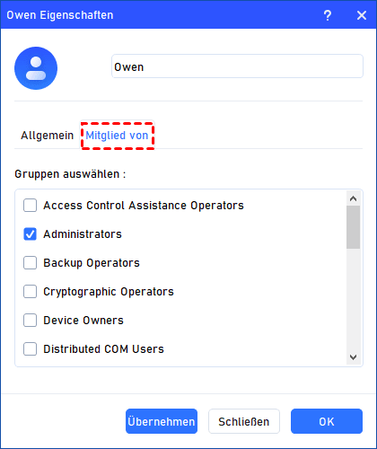 Wenn Sie dieses Benutzerkonto als Administrator festlegen möchten, klicken Sie auf die drei Punkte neben dem Kontonamen, wählen Sie dann „Eigenschaften“, anschließend „Mitglied von“, wählen Sie die Gruppe Administratoren aus und klicken Sie schließlich auf „Übernehmen“.