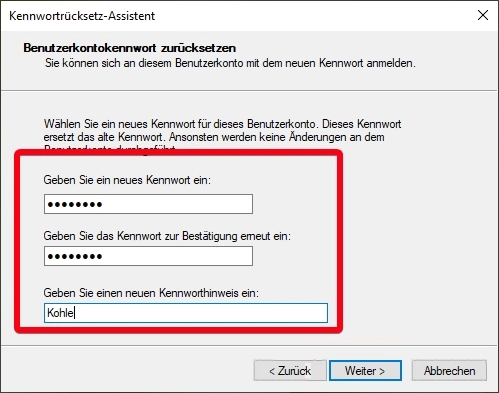 3. Klicken Sie in diesem Fenster auf „Weiter“, nachdem Sie das neue „Kennwort“ und den neuen „Kennworthinweis“ eingegeben haben.