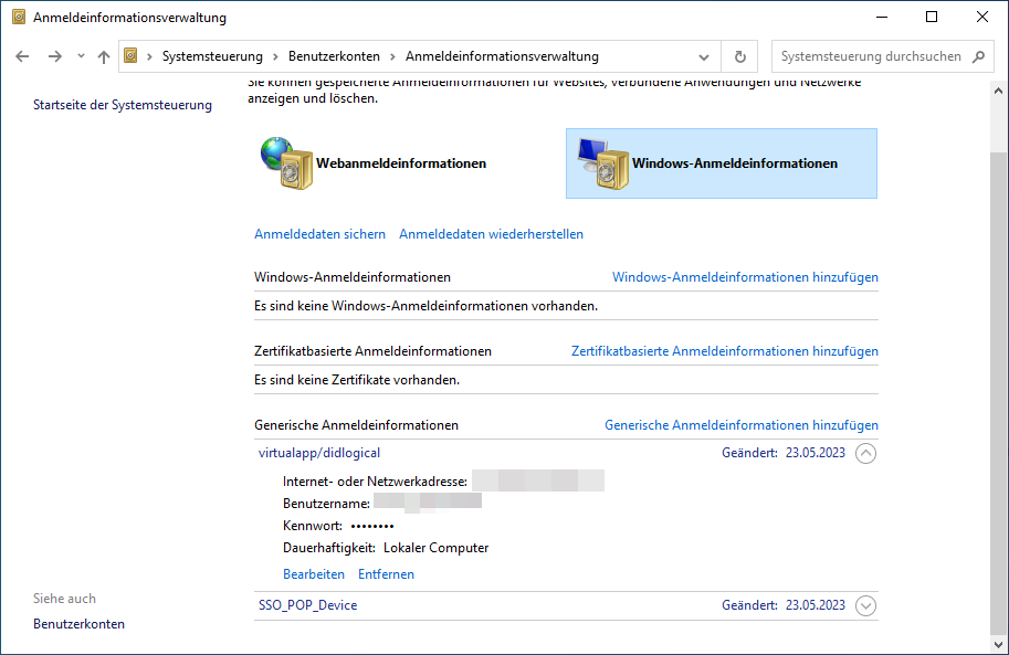 Unter der Anmeldeinformationsverwaltung gibt es einige Kategorien.