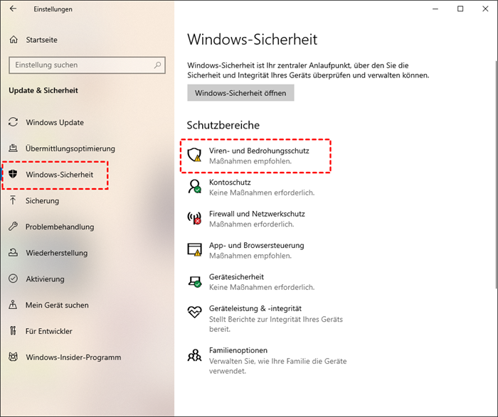 Schritt 1. Rufen Sie die Taskleiste auf und suchen Sie nach Windows-Sicherheit. Wählen Sie darunter die Option „Viren- und Bedrohungsschutz“.