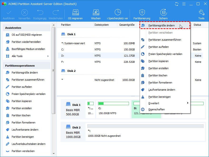 Schritt 1. Starten Sie Partition Assistant Server Edition. In der Benutzeroberfläche klicken Sie mit der rechten Maustaste auf die D-Partition und wählen Sie Partition verschieben/Größe ändern.