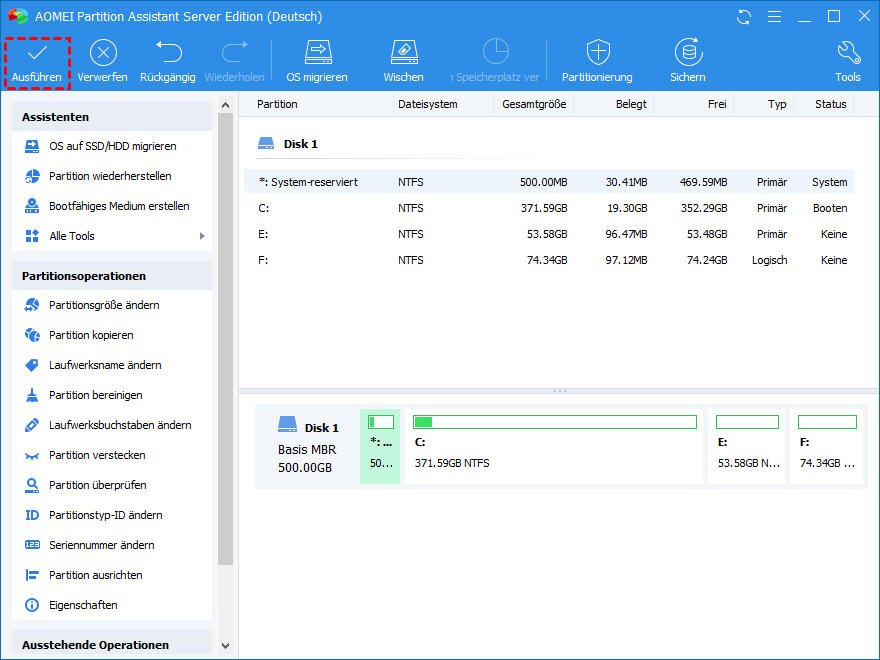 Glücklicherweise kann AOMEI Partition Assistant Server sogar in diesem Fall die primäre Partition ohne Datenverlust direkt erweitern, solange ein nicht zugeordneter Speicherplatz vorhanden ist. Wenn nicht, können Sie auch mit der Funktion „Freien Speicherplatz verteilen“ einfach eine Partition vergrößern.