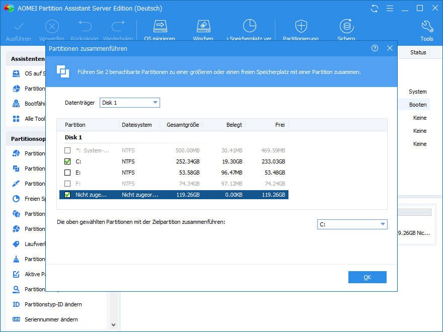 ✔ AOMEI Partition Assistant kann nicht zugeordneten Speicherplatz mit Laufwerk C: zusammenführen, egal ob der nicht zugeordnete Speicherplatz direkt hinter der primären Partition liegt oder nicht.